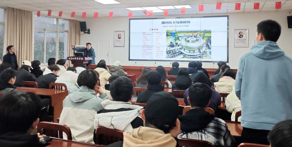 黄卓老师以《“人造太阳”中的等离子体原理》为题,回顾磁约束聚变的发展历程,展望核聚变实现商业发电的愿景,分析面临的挑战。他不仅讲述了为获得清洁、可持续的能源,发展可控核聚变的必要性和可行性,并聚焦高温等离子体在磁约束聚变中的应用,讲解了如何通过强磁场避免等离子体的散逸和提高等离子体的不稳定性。黄老师还以自己的研究感悟勉励在场同学:“人生积蓄着无穷无尽的能量,每一个人都蕴藏着巨大的能量,关键是如何引爆你人生的潜能,释放,燃烧!这就是人生的可控聚变,每个人都可以成为伟大的光源,照亮他人和世界。”