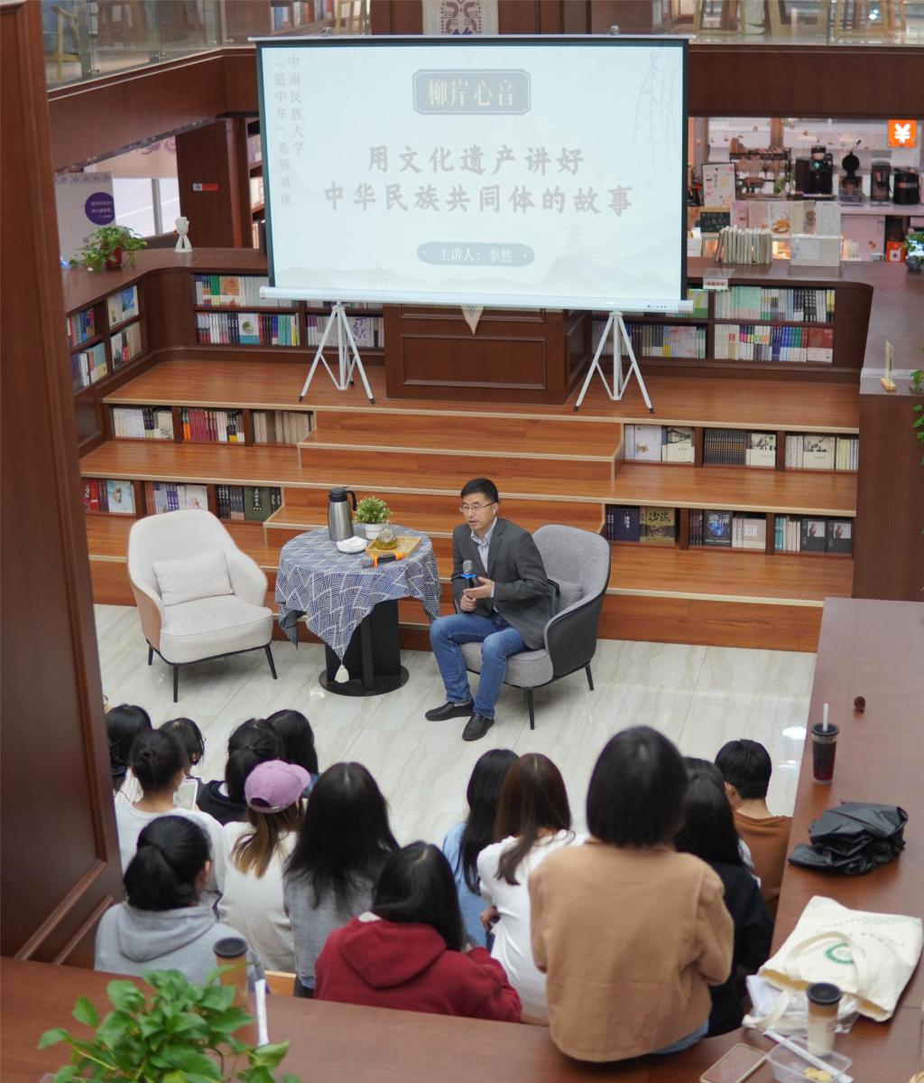4月2日下午,365官网“柳岸心音”线下沙龙之“道中华”系列讲座第一讲在图书馆倍阅书店开讲,民社学院李然教授带来题为《用文化遗产讲好中华民族共同体的故事》的讲座,大学生记者团成员现场参加。讲座由文学与新闻传播学院2021级学生黄琪祁主持。